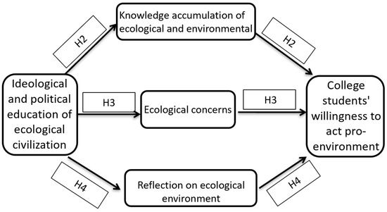 According to the above theoretical analysis, the ideological and political education of ecological civilization is helpful to promote the accumulation of ecological and environmental protection knowledge, ecological concern, and ecological reflection in college students. The improvement of their knowledge, concern, and reflection can promote their willingness to engage in pro-environmental behavior. According to the logical deduction, eco-education can promote their willingness to engage in pro-environmental behavior through three mediating transmission mechanisms (Figure 1).