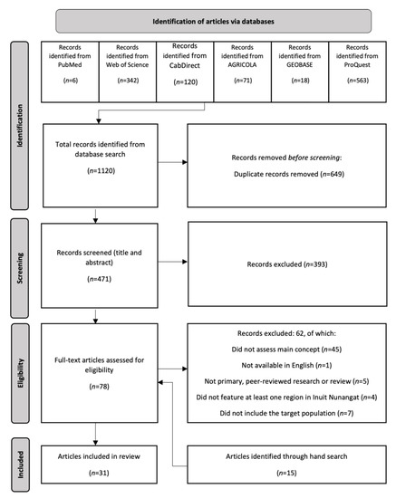 PRISMA flow diagram for identifying articles on the role of fisheries in food security in Inuit Nunangat.