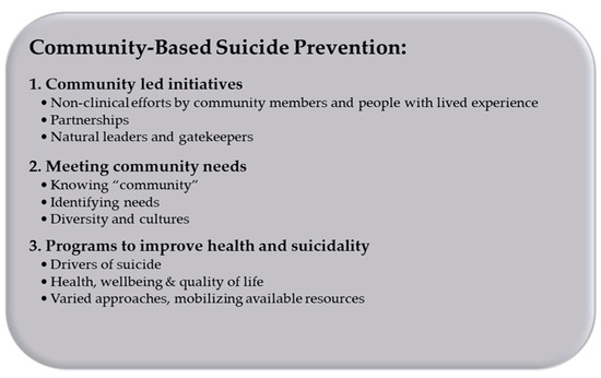 - Caine, E.D.; Reed, J.; Hindman, J.; Quinlan, K. Comprehensive, integrated approaches to suicide prevention: Practical guidance. Inj. Prev. 2018, 24 (Suppl. 1), i38. [Google Scholar] [CrossRef] [PubMed]