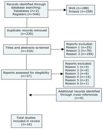 A total of 546 articles were initially obtained. After the review process and application of the criteria, 16 articles were finally selected. All were published between 2017–2022, with different locations across the globe. It should also be noted that all selected studies were developed or funded by research centres and/or universities, without finding any study subject to any specific governmental institution. The populations and fields of study present a wide heterogeneity among them, showing quantitative and qualitative studies.
