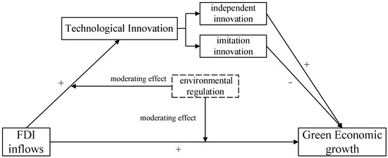 In summary, environmental regulation affects the impact of FDI on China’s green economic growth, and a portion of the intended effects of the regulation is achieved through the intermediary of technological innovation. The specific mechanism is shown in Figure 1: