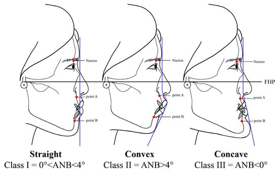 Malocclusion refers to an occlusal relationship that is aesthetically and functionally problematic because the arrangement of teeth is not aligned for various reasons, or the state of the upper and lower meshing is out of the normal position []. Malocclusion cases are divided into dental and skeletal malocclusion. Dental malocclusion occurs when abnormalities manifest in the size, position, and shape of the teeth, while skeletal malocclusion occurs when the mandible and teeth are not in harmony due to skeletal causes, or when the relationship between the mandible is undesirable within the facial structure complex []. This study was conducted as a comparison study of FSTT measurements between different skeletal classes based on malocclusion patients’ facial profiles. Specifically, participating malocclusion patients’ facial profiles were divided into three skeletal classes according to their ANB angles: I-straight, II-convex, and III-concave. In orthodontic diagnosis and treatment, this classification of facial profiles is important in conducting facial recognition.