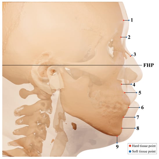 FHP was measured at 9 landmarks in the middle line of the anatomical landmark: 1. glabella (G); 2. nasion (N); 3. rhinion (Rhi); 4. subnasale (Sn); 5. labrale superius (Ls); 6. labrale inferius (Li); 7. labiomentale (Lbm); 8. pogonion (Pog); and 9. gnathion (Gn). Landmarks were perpendicular to the FHP or bone surface (Figure 2).