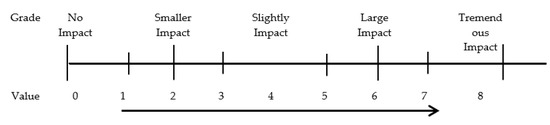 The N matrix reflects the degree of the relationship between indicators and has clear directivity. The matrix can be evaluated by experts, and the final value of each item in the matrix can be obtained by calculating the arithmetic mean value of each expert’s score. The value of bxy in the matrix was divided into 9 levels, and the corresponding situation between the value of bxy and the level is shown in Figure 2.