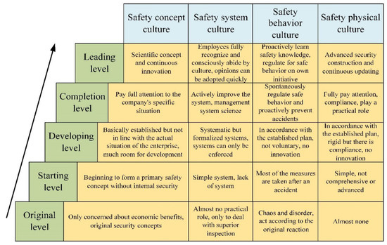 - The maturity level of safety culture was constructed and the maturity level of enterprise safety culture was divided into original level, starting level, development level, completion level, and leading level.