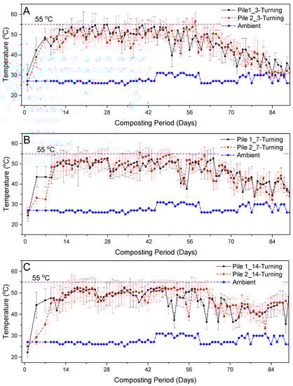 - Michel, F.C.; Forney, L.J.; Huang, A.J.F.; Reddy, C.A.; Drew, S.; Lindeberg, J.D.; Czuprenski, M. Effects of Turning Frequency, Leaves to Grass Mix Ratio and Windrow vs. Pile Configuration on the Composting of Yard Trimmings. Compost Sci. Util. 1996, 4, 26–43. [Google Scholar] [CrossRef]