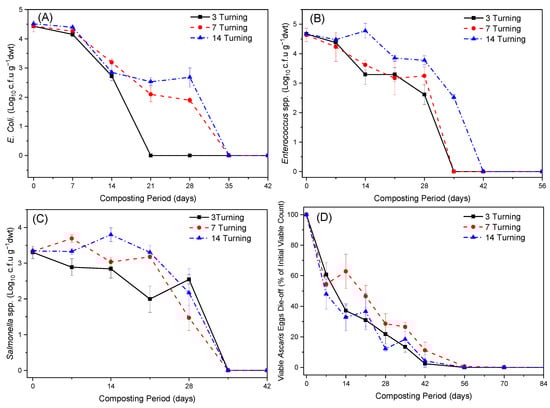 - Turning frequency had a significant effect on the survival of E. coli, Enterococcus spp., and helminth eggs (p < 0.05), except for Salmonella spp. (p = 0.150). This study suggests that high turning frequency promotes multiple cycles of heating, which may be more effective at destroying pathogens at relatively lower temperatures than the low turning frequency that exposes them to a single or few high-temperature cycles.