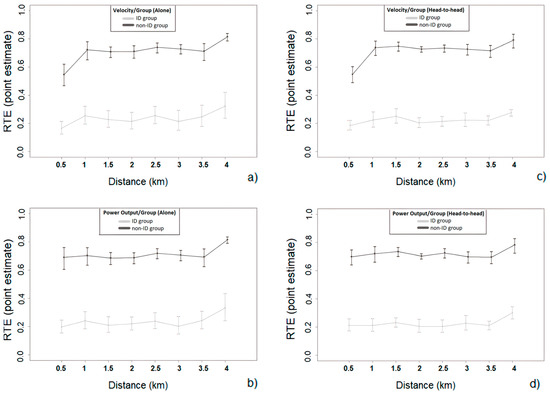 Relative effects and 95% confidence intervals for the velocity and power output of the ID and non-ID group during the ‘alone’ (a,b) and ‘head-to-head’ condition (c,d).