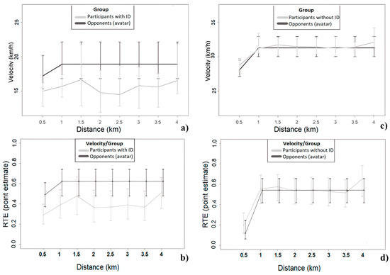 In this experimental study, we also compared the pacing and performance differences of the participants (with and without ID) with their virtual opponents (during the head-to-head trial). The comparison between the participants (‘head-to-head’) and their virtual opponents revealed significant velocity differences within the trials for the participants with, F(2.70, ∞) = 4.02, p < 0.001, and without ID, F(2.40, ∞) = 42.16, p < 0.001. However, the results did not reveal significant main effects nor interaction effects for both groups (see Figure 4).