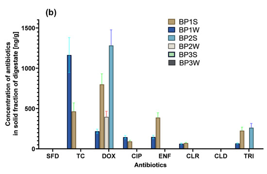 The abundance of antibiotics was highest in samples BP1S and BP1W from the BP stocked with sewage sludge. The concentrations of drugs belonging to each antibiotic class also differed considerably between the samples of sewage sludge digestate. Moreover, liquid and solid fractions of digestate also differed in terms of the presence and concentrations of the analyzed drugs. Antibiotics were identified more often and with similar frequency in the solid fraction. The presence of drugs in sewage sludge digestate could be attributed to substrate contamination before AD. Antibiotics are widely prescribed around the world, and they are not fully metabolized in the body, which is why high concentrations of pharmaceuticals are present in sewage sludge. Moreover, according to the literature, the incidence of acute respiratory infections varies on a seasonal basis [31], which is why drug consumption and transmission to WWTPs with wastewater is intensified in selected seasons of the year [32]. Therefore, significant quantities of antimicrobials that are not biodegraded in the wastewater treatment process can be carried to sewage sludge, which is used as a substrate in bioreactors, which explains their presence in the examined digestate samples. It should also be noted that pharmaceuticals including antibiotics are often overused and used without medical guidance, which can significantly increase their concentrations in sewage sludge [33,34].