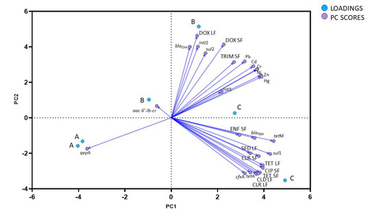 Principal component analysis was used using all data from all samplings as variables to assess the overall patterns and variances of antibiotic concentrations, ARG, and HM levels in the BP digestate samples. The PCA produced three main data clusters (Figure 3). On the PCA-presented mean loadings for ARGs, the content of antibiotics and HMs, and mean PC scores for biogas plants: A—biogas plant 1 (BP1), B—biogas plant 2 (BP2) and C—biogas plant 3 (BP3). The results for BP2 (B) revealed strong correlations between the values of DOX, blaOXA, sul2, intI1, intI2, HMs, and TRI. The second cluster was formed by BP1, with strong correlations between the values of ENF, SFD, CLR, CLD, CIP, TC, cfxA, tetA, tetM, sul1, and blaTEM. However, strong correlations with HM values were not observed. The values noted in each cluster suggest that resistance-inducing antibiotics, ARGs, and HMs had a common source. It can be concluded that the biogas plant processing both sewage sludge and liquid manure is a reservoir of drugs, ARGs, and HMs. The results of the PCA also indicate, with high probability, that HMs could contribute to an increase in ARG concentrations in the BP processing cattle manure (BP2) and promote the spread of AR. According to previous research [82], the presence of strong correlations between ARGs in digestate suggests that ARB could be present already in raw substrates. In the present study, the antibiotics detected in digestate samples could have exerted selection pressure during the AD process.