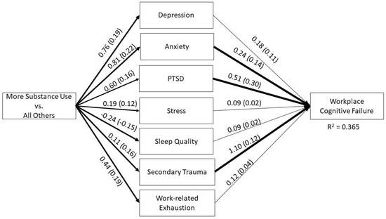 A summary path diagram of the hypothesized model testing the effects of reported increased substance use on workplace cognitive failure via multiple psychological mediators. Unstandardized coefficients (standardized coefficients) are reported for each path; bolded paths indicate statistical significance (p < 0.05). The cumulative model accounted for 37% of the variability in the outcome.