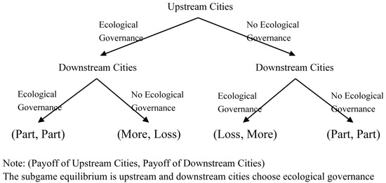 The watershed horizontal ecological compensation rules can be regarded as a sequential game. Figure 2 shows the sequential game: upstream cities are the first movers, and their governments need to make a trade-off between sacrificing productivity and receiving compensation. If the upstream city completes the ecological governance of the upstream watershed, then the upstream city is expected to receive more compensation returns. However, suppose the upstream city cannot achieve ecological governance in the short term. In that case, its government needs to make ecological compensation for the environmental pollution caused to the downstream city because their behavior has imposed external costs on the downstream city [30]. Therefore, the increase in GTFP in upstream cities is mainly due to the “compensation effect” brought about by the expectation of obtaining ecological compensation. For downstream cities, they are followers, and their governments need to formulate the best response based on the behavior of upstream cities. If the upstream cities successfully achieve ecological governance, even if the governments of the downstream cities do nothing, they still need to give the upstream cities ecological compensation. Additionally, if the downstream cities have achieved ecological governance, and the governance situation is as good as the upstream cities, then the conservative position is that the downstream cities get at least part of the ecological compensation. For downstream cities, the best response to any situation should be to choose ecological governance. Therefore, the increase in GTFP in downstream cities is mainly due to the “forced effect” of policies. The WHEC policy has successfully realized cross-government ecological governance co-operation through internalizing external costs. However, the conditions for the success of this policy require strict supervision by the central government [36]. This is because both the upstream city government and the downstream city government have the incentive to conceal their level of environmental pollution [26], to obtain ecological compensation.