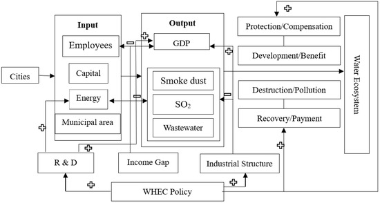 In addition to the intrinsic motivation of obtaining ecological compensation to improve their green ecological development, other factors can play a moderating role on the policy’s effect in the policy-implementing cities. Firstly, technological progress is a crucial factor affecting ecological governance. Regions with advanced technology can produce higher output with lower input, reduce pollution emissions, and achieve green production [42]. Besides, technological progress is also a crucial factor for economic growth [43], and technological progress cannot be separated from R&D expenditure [44]. Therefore, a city with higher R&D expenditure is more able to improve its green production efficiency, and the implementation effect of the WHEC policy is also improved. In addition, to realize the ecological management of rivers, it is necessary to adjust the industrial structure of cities in the watershed. It is generally believed that secondary industry produces the most severe pollution [45,46]. After implementing the WHEC policy, the pilot city governments are expected to limit the pollution emissions of secondary industry. Nevertheless, the contribution of the secondary sector to economic development is essential [47]. Limiting pollution emissions will also restrict the output of enterprises, thereby affecting the city’s economic growth. So, in a city with an advanced industrial structure, the pollution discharge is less, and the policy effect should be greater, thereby improving the production efficiency of the city. Further, when the government attempts to manage water ecology, it must convert a lot of farmlands into forests to protect the environment. When farmers lose the land on which they live, it will hurt the farmers’ income [48]. Additionally, this releases many rural laborers and farmers who have to go to cities to seek a living, thereby speeding up urban economic development. However, this measure has exacerbated the development gap between urban and rural areas and the income gap between their respective residents [49]. Consequently, in areas with a higher income gap, farmers will be more reluctant to give up their land, thus reducing the policy’s positive effect on the area’s green ecological development. The conceptual framework can be seen in Figure 3.
