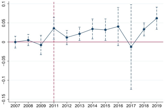 Figure 6 reports the results of the parallel trend test, showing that the treated and control groups had the same trend before 2011, which supports the parallel trend hypothesis and verifies the rationality of the DID method. Overall, the WHEC policy has a positive effect on improving the city’s GTFP.