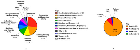 In 2017–2020, there were 4598 fatalities reported in the OSHA fatality inspection database. Of the 4598 fatalities reported, 89 (1.9%) were characterized as exertion-related (fatality rate: 0.0160 per 100,000 full-time equivalent workers, 95% CI 0.009, 0.0134; Table 3). The exertion-related fatalities consisted of heat-related (87.6%, n = 78), cardiac events (8.9%, n = 8), cold-related (2.4%, n = 2), and asthmatic events (1.1%, n = 1; Table 4, Figure 1A). Fatalities occurred most in the Southeast (n = 28), in the construction industry (n = 24, Figure 1B), and among workers who were nonunionized (80.8%). Within the exertion-related heat fatalities, 6.4% (n = 5) were within businesses that had over 500 employees, 15.4% (n = 12) with 100–500 employees, 69.2% (n = 54) fewer than 100 employees, and 8.9% (n = 7) were unknown.