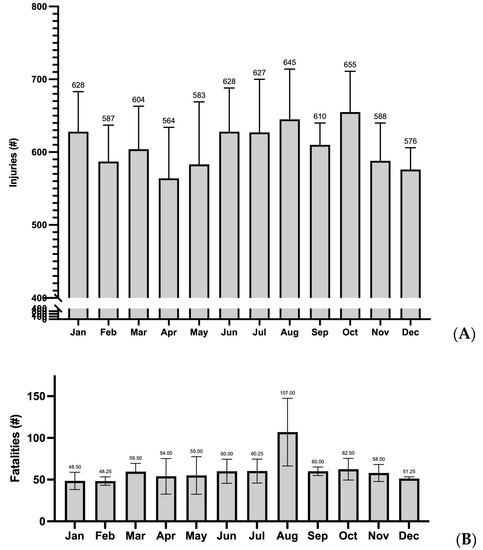 Average number of accident-related severe injury per month (2015–2020). (A) Average number of accident-related fatalities per month (2017–2020). (B). Note: number above each bar = average number of injuries/fatalities each month.