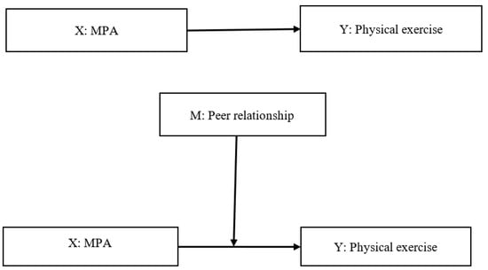 On the basis of the research background presented above, this study explores the following questions through empirical investigation: (1) What are the current characteristics of MPA, physical exercise behavior, and peer relationships of university students? (2) Do MPA and peer relationships affect university students’ physical exercise? (3) Do peer relationships have a moderating effect when MPA affects the physical exercise of university students? (Figure 1).