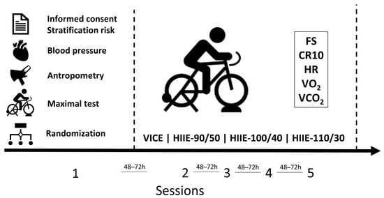 In order to establish the relationship between exercise intensity and affective valence, four internal load indicators were chosen to be included in the analysis. The oxygen consumption (VO2), dioxide carbon output (VCO2), and heart rate (HR) were used as physiological indicators of the exercise intensity, while the Category Ratio Scale (CR10) was used as a psychological indicator of the exercise intensity. The VO2 and VCO2 were included considering their relationship with aerobic and anaerobic demands during exercise, respectively [12]. The HR is an indicator of cardiovascular load during exercise, and CR10 is a psychological indicator of the internal load. Therefore, the exercise intensity was quantified by different internal load variables to determine the dose–response relationship between HIIE intensity and affective valence. The affective valence was measured using the Feeling Scale (FS) [13]. On these methodological premises, participants were asked to perform five visits on a cycle ergometer (RacerMate CompuTrainer, Seattle, WA, USA). During the first visit, participants signed the consent form and completed the risk stratification questionnaire [11]. Then, the resting heart rate (HR), blood pressure, and anthropometric measurements were taken. After these procedures, participants completed the maximal test in which HR and respiratory exchange variables were continuously recorded to determine peak VO2, peak VCO2, peak HR, and peak power (WPeak). The FS [13] and the CR10 [14] were also applied throughout the test to familiarize the participants with the scales. The four subsequent visits included one vigorous-intensity continuous exercise (VICE) used as a control condition and three HIIE exercise protocols performed in a counterbalanced order. The exercise protocols were performed at the same average intensity (70% of peak power—WPeak) and total duration (20 min), with different amplitudes. In this sense, a VICE session was conducted at 70% WPeak as previously described [3]. This strategy was adopted to equalize the exercise conditions into the heavy exercise domain [15], allowing us to establish the relationship between HIIE stimulus and recovery intensities and the affective valence. All sessions were conducted under similar environmental conditions in the laboratory (humidity ≈ 60% and temperature ≈ 22 °C). The physiological (respiratory variables and HR) and psychological (FS and RPE) variables were recorded during the exercise sessions. Figure 1 shows the experimental design of the study.