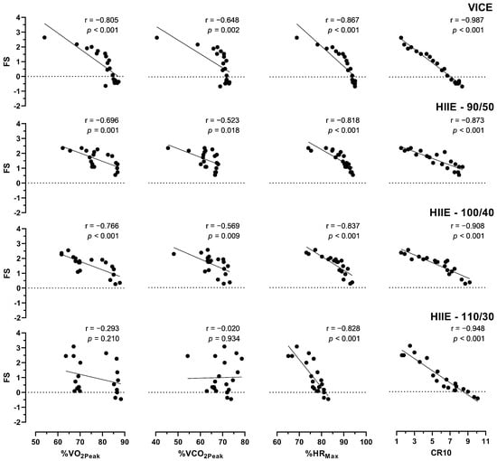 Null to high correlations were found across the exercise conditions and variables, as shown in Figure 2. All intensity variables presented significant inverse low and high correlations in VICE, HIIE-90/50, and HIIE-100/40. For the HIIE-110/30 condition, significant moderate and high inverse correlations were observed only for %HRMax and CR10, respectively. However, nonsignificant null correlations were observed for %VO2Peak and %VCO2Peak, indicating that these variables were unrelated to the affective valence in HIIE-110/30. The %HRMax and CR10 presented higher inverse correlations with FS, indicating that both internal load variables could be used as markers for affective valence. In addition, %VO2Peak and %VCO2Peak presented low-to-moderate inverse correlations for VICE, HIIE-90/50, and 100/40 conditions.