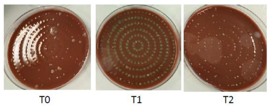 The number of bacterial colonies in the samples collected during ultrasonic scaling (T1) was higher, although, similar to the T0 sampling, the bacteria identified were predominantly of the Gram-positive species, but in this time the most abundant species belonged to the Streptococcus spp. family with a load of 200–300 CFU/m3, including Streptococcus salivarius and Streptococcus mutans. Air samples collected immediately after ultrasonic scaling (T2) showed a decrease in bacterial load compared to the previous sampling.