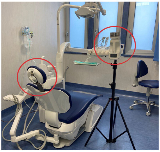 For each procedure, the air sampler was placed at the average working distance of the clinicians involved in the study (and from the aerosol source), 30 cm, at the height of 1.5 m above the floor, which corresponded to the area where the patient was breathing (Figure 2).