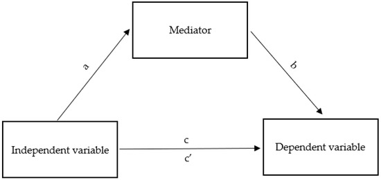 The material collected during the study was subjected to quantitative analysis. Due to their measurable nature, the results of the analyzed parameters were presented using the values of basic descriptive statistics. The Kolmogorov–Smirnov test verified the distribution of quantitative variables. To build a mediation model, mediation analysis in the regression was applied, using the classical approach of Baron and Kenny [50], which consists of testing the mediation relationship by checking other relationships in three steps (Figure 1):