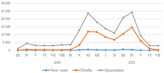 The discussion of the results of this study began with an analysis of descriptive statistics and the distribution of outcomes by period. In the case of data for the COVID-19 outbreak in Poland, an increase in new cases of SARS-CoV-2 infection, deaths due to the virus, as well as people quarantined after September 2020 was observed. This increase continued for two months, followed by a decrease in the aforementioned indicators, until February 2021. For the following months, there was again an increase in the aforementioned indicators until April 2021, and from then until July 2021, the values of the aforementioned indicators decreased (Figure 2). Throughout the period from March 2020 to July 2021, the average monthly number of new cases of SARS-CoV-2 viral infection was 167.61 (SD = 217.14; 2.31–644.09) thousand, while the number of deaths was an average of 4394.88 (SD = 4942.76; 33–14,250) per month. On the other hand, during quarantine, the average was 4977.09 (SD = 3308.71; 1094.3–11,679.16) thousand people per month (Table 1).
