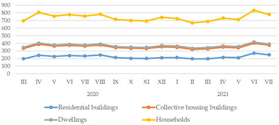 Tap water consumption in household buildings in Rybnik and the surrounding areas was distributed at a similar level throughout the studied period of the COVID-19 pandemic, while slight increases in water consumption were observed in the months of April and August 2020, at the end of 2020–2021, and in April and June 2021. This was true for residential buildings, collective housing, dwellings and all households (Figure 3). Among all these groups of tap water users, residential buildings displayed the highest consumption rates, averaging 221.73 (SD = 22.1; 196.46–271.92) thousand cubic meters per month. Second in this respect were collective housing buildings, where tap water consumption averaged 133.01 (SD = 5.07; 123.7–144) thousand cubic meters per month. Significantly lower tap water consumption was in dwellings, averaging 15.09 (SD = 0.57; 14.45–16.57) thousand cubic meters per month. In contrast, all households consumed an average of 369.82 (SD = 22.97; 334.92–417.28) thousand cubic meters of tap water per month in the analyzed period (Table 2).