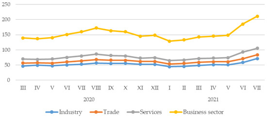 As for the business sector in Rybnik and the surrounding areas, there was a gradual increase in tap water consumption (for both industries, trade and services, and the overall business sector in general) from April to August 2020. A gradual decline in water consumption followed this month until January 2021 (with a slight deviation from this downward trend in December 2020). After that, a gradual increase in water consumption by companies is noticeable, with the growth taking a more pronounced form after May (Figure 4). On the other hand, over the entire period analyzed, the average tap water consumption in the business sector was 76.77 (SD = 10.36; 64.39–105.54) thousand cubic meters per month. Companies in the industrial sector consumed an average of 52.29 (SD = 6.24; 44.64–71.18) thousand cubic meters of water per month, the trade sector consumed 10.11 (SD = 1.15; 8.13–12.45) thousand cubic meters, and the service sector consumed 14.37 (SD = 3.55; 10.58–22.08) thousand cubic meters, respectively (Table 3).