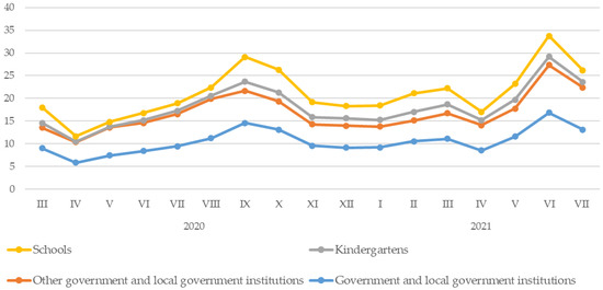 Government and local government institutions recorded the most significant jumps in all groups’ tap water consumption. After the first month of the analyzed period (in April 2020), there was a marked decline in tap water consumption by schools, kindergartens, other government and local government institutions, and all such entities in general. In the next five months, until September, there was a gradual increase in the aforementioned indicator, followed by a decrease in the next two months, to remain stable for the period from November 2020 to January 2021. After that, water consumption increased until July 2021 (except for April, when lockdown tightening was introduced nationwide) (Figure 5). Over this period, the average monthly tap water consumption in all government institutions in Rybnik and the surrounding neighbourhoods was 10.52 (SD = 2.74; 5.84–16.88) thousand cubic meters. Schools consumed an average of 2.97 (SD = 1.34; 1.04–5.44) thousand cubic meters of water per month, kindergartens consumed 1.3 (SD = 0.64; 0.13–2.02) thousand cubic meters, and other government institutions consumed 6.25 (SD = 1.79; 4.54–10.45) thousand cubic meters of water per month (Table 4).
