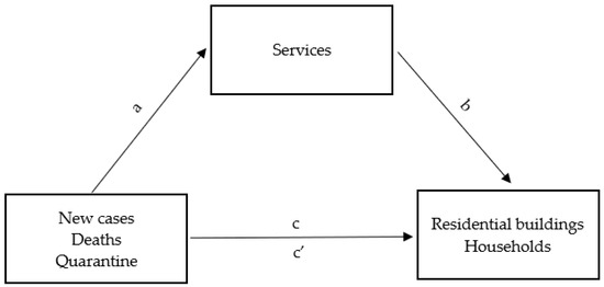 Next, a mediation model was constructed, assuming the existence of a relationship between the epidemic in Poland and the choice of residents of Rybnik and its surroundings to stay in their houses or apartments, taking into account the mediating role of the operation of service industry enterprises in this city and its surroundings. A diagram of the relationship between the aforementioned variables in the mediation model is presented in Figure 6.