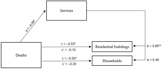 Mediation model for the impact of deaths due to SARS-CoV-2 viral infection in Poland on the choice of residents of Rybnik and surrounding areas to stay in households —mediating role of service industry functioning in Rybnik and surrounding areas. * p < 0.05; ** p < 0.01.