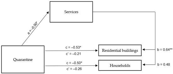 Mediation model for the effect of new cases of SARS-CoV-2 viral infection in Poland on the stay in households of residents of Rybnik and the surrounding areas—the mediating role of the functioning of the service industry in Rybnik and the surrounding areas. * p < 0.05; ** p < 0.01.