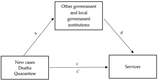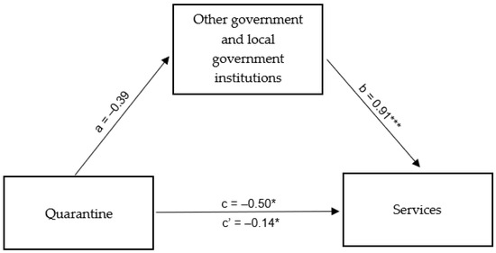 Mediation model for the effect of the number of people quarantined due to the COVID-19 epidemic in Poland on the functioning of the service industry in Rybnik and the surrounding areas—the mediating role of the functioning of other government and local government institutions in Rybnik and the surrounding areas. * p < 0.05; *** p < 0.001.
