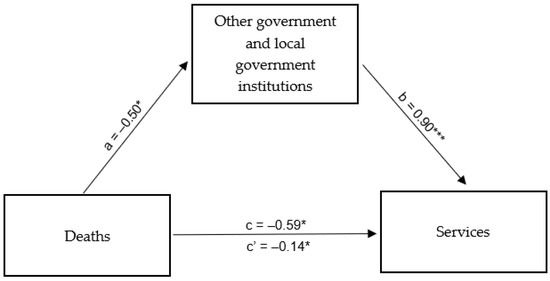 Mediation model for the effect of deaths caused by SARS-CoV-2 infection in Poland on the functioning of the service industry in Rybnik and the surrounding areas—the mediating role of the functioning of other government and local government institutions in Rybnik and the surrounding areas. * p < 0.05; *** p < 0.001.