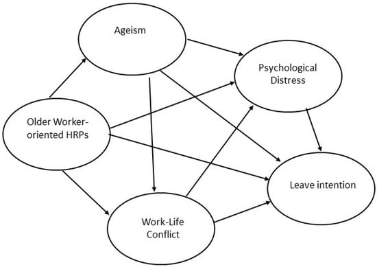 The following section describes the hypothesis development for the relationships between OW-HRPs, Psychological Distress, Intention to Leave, Work–life Conflict and Ageism. The literature supporting the development of the five hypotheses is discussed with the hypothetic model presented at the end of this section.