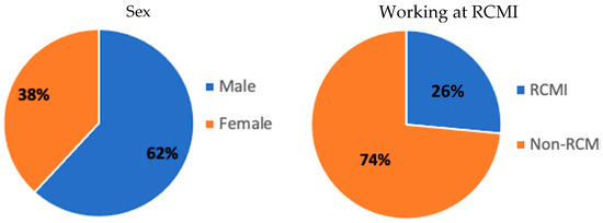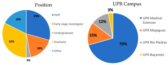 The total course participants were 34 Hispanic members of the different campuses at UPR. Figure 1 describes the demographics and other information of the participants. Sixty-two percent were men, and thirty-eight percent were women. Seventy-one percent of the students belonged to the Medical Sciences Campus, 15% to the Mayagüez Campus, 12% to the Rio Piedras Campus, and 3% to the Bayamón Campus. There was a greater representation of graduate students (32%) and staff (29%—including professors, technicians, postdocs, or resident physicians). Early-stage investigators (18%), other interested personnel (8%), and undergraduates (3%) also benefited from the course. From the pool of participants, twenty-seven percent are working at the RCMI-Center for Collaborative Research in Health Disparities.