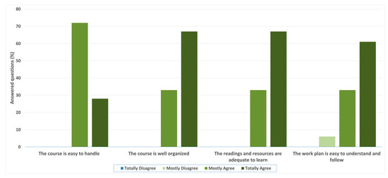 Through the completion of a survey, participants evaluated the course. Question #1 results are described in Figure 2 and assess the structure and design of the course, indicating the participant’s level of agreement with the statements. The responses were recorded on a Likert scale where Totally Disagree = 1, Mostly Disagree = 2, Mostly Agree = 3, and Totally Agree = 4. In the first statement, “The course is easy to handle”, the results were 72% “mostly agree” and 38% “totally agree”, equaling a mean value of 3.29 ± 0.21. When asked about “The course is well organized” and “The readings and resources are adequate to learn about the topics of the course”, the results were 38% “Mostly agree” and 67% “totally agree”, resulting in a mean value of 3.71 ± 0.21 on both statements. For the last question, “The work plan is easy to understand and follow”, 6% of students “mostly disagree”, 38% “mostly agree”, and 61% “totally agree”, equaling a mean value of 3.59 ± 36.