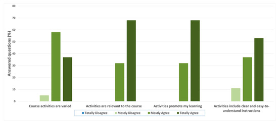 Figure 3 shows the results for the second group of statements (Question #2) regarding the assessments of the course activities, such as tests and tasks. The first statement was “Course activities are varied”, where 58% of participants “mostly agree”, 37% “totally agree”, and 5% “mostly disagree”, equaling a mean value of 3.20 ± 0.21. For the statements “Activities are relevant to the course” and “Activities promote my learning”, the results were 68% “totally agree” and 32% “mostly agree”, equaling a mean value of 3.71 ± 0.21 on both statements. To the premise “Activities include clear and easy-to-understand instructions”, the participant answers were 53% “totally agree”, 37% “mostly agree”, and 11% “mostly disagree”, equaling a mean value of 3.41 ± 0.48.
