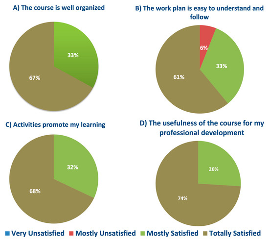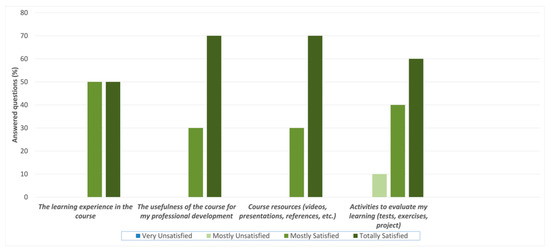 For the statements in Question #3, the participants were asked about their general level of satisfaction with different course elements (Figure 4). The responses were recorded on a Likert scale: Very Unsatisfied = 1, Mostly Unsatisfied = 2, Mostly Satisfied = 3, and Very Satisfied = 4. For the premise “The learning experience in the course”, the results were 50% for both “mostly satisfied” and “totally satisfied”, equaling a mean value of 3.53 ± 0.25. For the statements “The usefulness of the course for my professional development” and “Course resources”, 70% of the participants were “totally satisfied” and 30% were “mostly satisfied”, equaling a mean value of 3.76 ± 0.28 for both statements. Concerning the “Activities to evaluate my learning”, 10% of the participants were “mostly unsatisfied”, 60% were “totally satisfied”, and 40% were “mostly satisfied”, equaling a mean value of 3.53 ± 0.37.