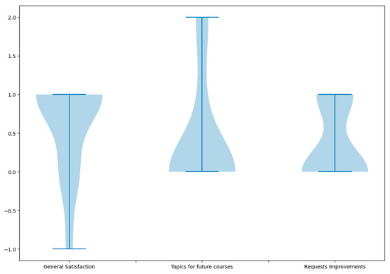 An open-ended question (Question #5) was related to participants’ comments and suggestions. To quantitatively analyze this question, the comments were classified into the three categories that the students mentioned: (1) “general satisfaction with the course”, (2) “topics suggested for future courses”, and (3) “requests for improvements in the current course”. For each comment, there was a classification value by category. For example, for category (1) “general satisfaction with the course”, a comment was classified as 1 for high satisfaction, 0 for a neutral comment or comment that did not address satisfaction, and −1 for negative comments or comments that indicated dissatisfaction with the course. Then, the numbers by categories were counted and tabulated, and the mean and other descriptive statistics were computed.