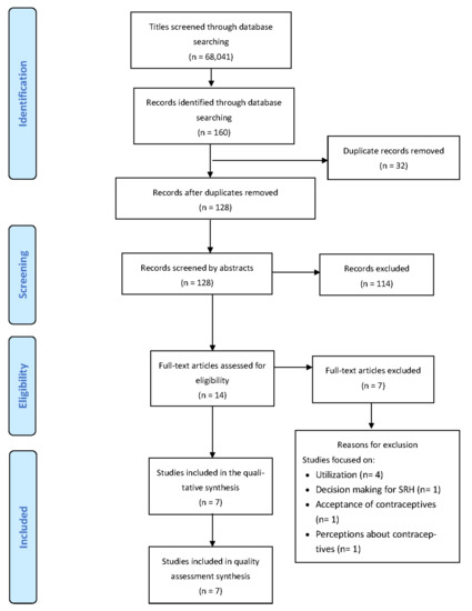 Overall, 160 articles were identified based on the title screening search criteria, after screening through 68,041 titles (see Table 3). At the title screening stage, 67,881 articles were removed because they met the exclusion criteria (i.e., those with no evidence on adolescent girls aged 10–19, contraceptive use, decision-making, and those conducted outside of SSA). A total of 32 duplicates were removed, and 128 titles were included for abstract screening. These articles were exported to the Endnote library for abstract screening. Following the screening of the abstracts, 14 were included for full article screening, while 114 were excluded. A total of seven articles were excluded because four focused on the utilisation of contraceptives; one on decision-making for sexual and reproductive health (SRH); one on acceptance of contraceptives; and one on perceptions about contraceptives. Only seven articles met the eligibility criteria and were included in the final analysis and qualitative synthesis.