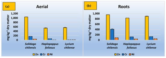 According to Figure 2, Solidago chilensis presented higher concentrations among the species studied in roots and aerial parts for all metals—Zn, Cr and Ni. In the case of Zn, the concentration in the aerial parts slightly exceeded its concentration in roots, at around 1000 mg·kg−1. Haplopappus foliosus and Lycium chilense presented concentrations of Zn of 834 and 902 mg·kg−1 in roots, respectively, and approximately 550 mg·kg−1 in aerial parts in both cases.