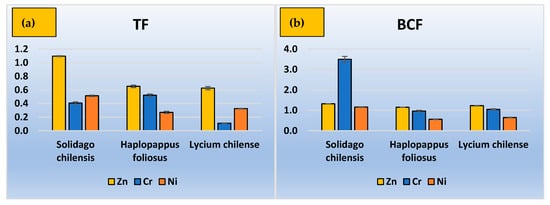 The translocation and bioconcentration factors were calculated for each plant and metal, and the mean values are presented in Figure 3. As can be seen from this figure, almost all species showed a TF < 1, except Solidago chilensis, which exhibited TF = 1.1 for Zn. The same species presented a value of BCF higher than 1 for all elements under study, with an extremely high value of 3.5 for Cr; therefore, Solidago chilensis could be a candidate for Zn phytoextraction, and a BCF > 1 with a TF < 1 indicates a tendency towards the phytostabilization of Cr and Ni.