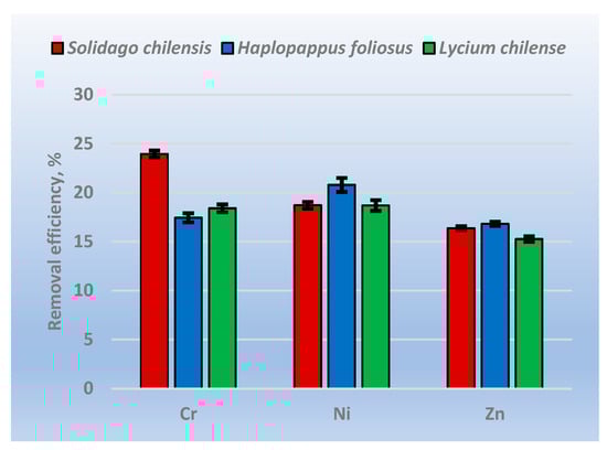 As can be seen from Figure 4, the maximum removal efficiency of 24% was obtained for Cr with Solidago chilensis, and the maximum removal efficiency for Ni and Zn was obtained with Haplopappus foliosus was 20.8% and 16.8%, respectively. Among the three metals analyzed, Zn presented the lower removal efficiency values, between 15 and 17%; the removal efficiency for Ni was in the range of 18.5% and 21%, and finally, for Cr, values between 17% and 24% were obtained.