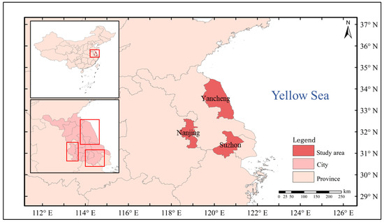 This study was conducted in three cities (Nanjing, Suzhou and Yancheng) with different latitudes in Jiangsu Province, China (Figure 1). These three cities included a total of 25.8 million people in 2010. Jiangsu Province is one of the more developed provinces in China and has experienced rapid urbanization [33]. Nanjing (31°14′ N–32°37′ N, 118°22′ E–119°14′ E), the capital of Jiangsu Province, is located centrally within the province. Nanjing has a northern subtropical, humid monsoon climate. From 2007 to 2015, in Nanjing, the annual average temperature was 16.4 °C, the annual precipitation was 1201.6 mm, the average temperature of the coldest month (January) was 3.0 °C and the average temperature in the hottest month (July) was 28.3 °C [34]. Suzhou (30°47′ N–32°02′ N, 119°55′ E–121°20′ E), located in the south of Jiangsu Province, is characterized by extensive rural industrialization and dramatic economic growth. From 2007 to 2015, the annual average temperature was 17.3 °C, the annual precipitation was 1170.2 mm, the average temperature of the coldest month (January) was 4.3 °C and the average temperature in the hottest month (July) was 29.3 °C. Nanjing and Suzhou lie along the Yangtze River. Yancheng (32°48′ N–34°29′ N, 119°53′ E–121°18′ E) is in the northern coastal area of Jiangsu Province and has an integral ecosystem and high habitat value. Yancheng has a subtropical monsoon climate, whereas Suzhou has a subtropical monsoon marine climate. From 2007 to 2015, in Yancheng, the annual average temperature was 15.0 °C, the annual precipitation was 1025.5 mm, the average temperature of the coldest month (January) was 1.5 °C and the average temperature in the hottest month (July) was 27.3 °C.