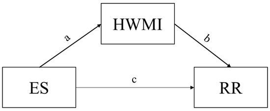 The process analysis method was then utilized to explore the effect mechanism of the Ess, HWMI and RRs, which is an in-depth analysis [54]. The process of mediation is a causal explanation, which assumes that the mediator is causally located between an independent variable (X) and a dependent variable (Y) [55]. The mediating effect refers to how the effect of X on Y is realized by the mediating variable (M) [56]. The model of the mediating effect is shown in Figure 2. In this study, the independent variable (X) is the Ess, the mediating variable (M) is the HWMI and the dependent variable (Y) is mortality risk. The coefficients a, b and c are the path coefficients of the mediation effect model. Coefficient a is the direct effect of X on M, coefficient b is the direct effect of M on Y, and coefficient c is the direct effect of X on Y. The test of joint significance (TJS) was used to test the mediating effect in this study. This approach requires that both the direct effects of X on M and M on Y be statistically significant, and it does not test the total effect and direct effect of X on Y. The mediating effect analysis was conducted in PROCESS, a plug-in for SPSS 25.0.