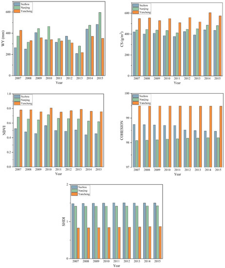 The spatial–temporal patterns of the ecosystem services in Jiangsu Province from 2000 to 2015 are shown in Figure S1. According to the results in 2000, water supply service, carbon sequestration service and culture service showed an increasing trend in Jiangsu Province, whereas cooling service and biodiversity showed a declining trend. From southeast to northwest, two ecosystem services, i.e., water supply service and carbon sequestration service, display a high-to-low trend; the other three ecosystem services, i.e., cooling service, biodiversity and cultural service, exhibit heterogeneity between the north and the south. Small values of the NDVI and COHESION are mainly observed in the southern areas, which experienced a more rapid urbanization process [57]. In contrast to COHESION, the largest SHDI value was found in the southern area of Jiangsu Province, where developed urban areas lie. Specifically, the vegetation coverage area and connectivity of habitats has decreased due to the process of urban expansion and development.