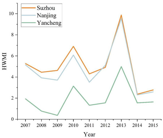 Spatial–temporal patterns of the HWMI in Jiangsu Province are shown in Figure S2. According to the spatial–temporal patterns of the HWMI, heat waves in the north and coastal areas are less severe than those in the south. Jiangsu Province had the highest HWMI in 2013. The decline in the HWMI in 2015 may have been affected by atmospheric circulation. From 2000 to 2013, the high-grade heatwave areas tended to spread from south to north. For the HWMI of Nanjing, Suzhou and Yancheng, Suzhou increased the most, followed by Nanjing and Yancheng. Heatwave events in Suzhou and Nanjing are significantly more severe than in Yancheng. Besides latitude, discrepancies between the three cities may also be affected by rapid urbanization. The trends of the HWMI in Nanjing, Suzhou and Yancheng from 2007 to 2015 are shown in Figure 4. The HWMI of the three cities showed similar trends. The HWMI in Nanjing and Suzhou was higher than that in Yancheng. Additionally, the heat waves were most severe in 2010 and 2013.